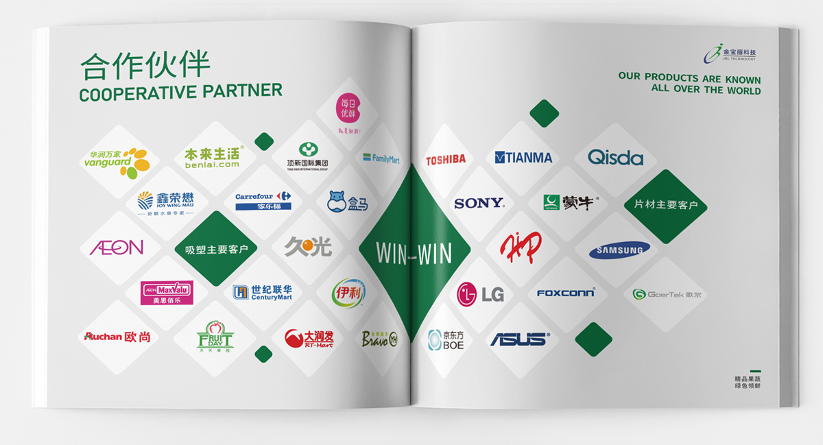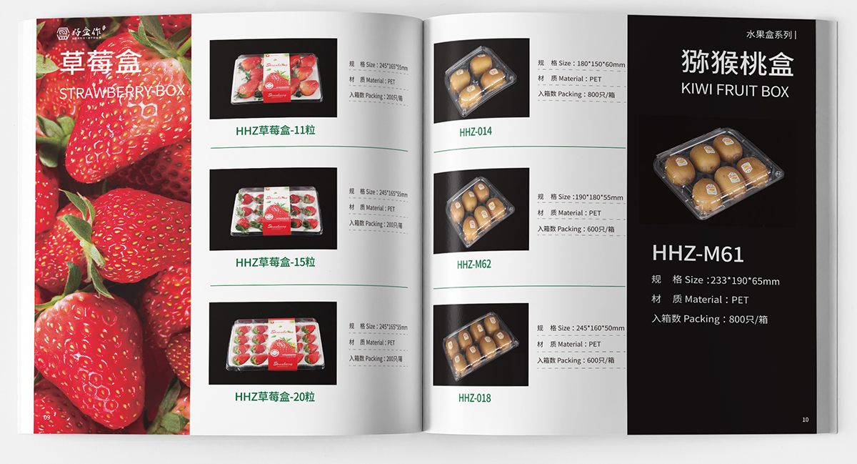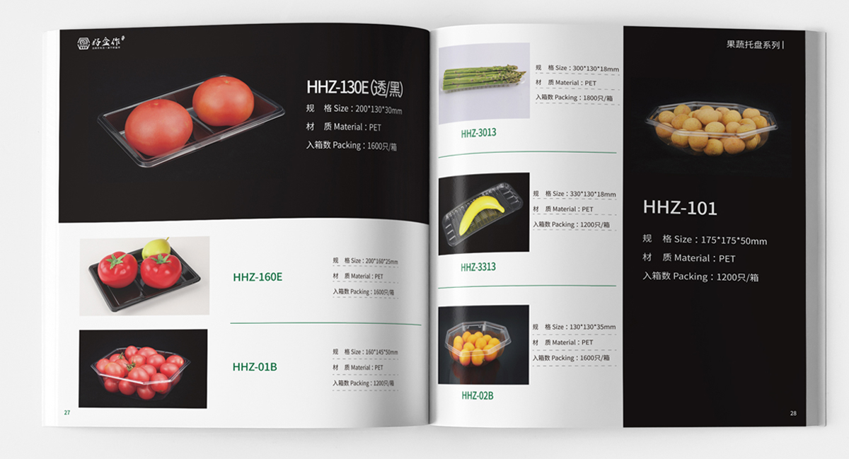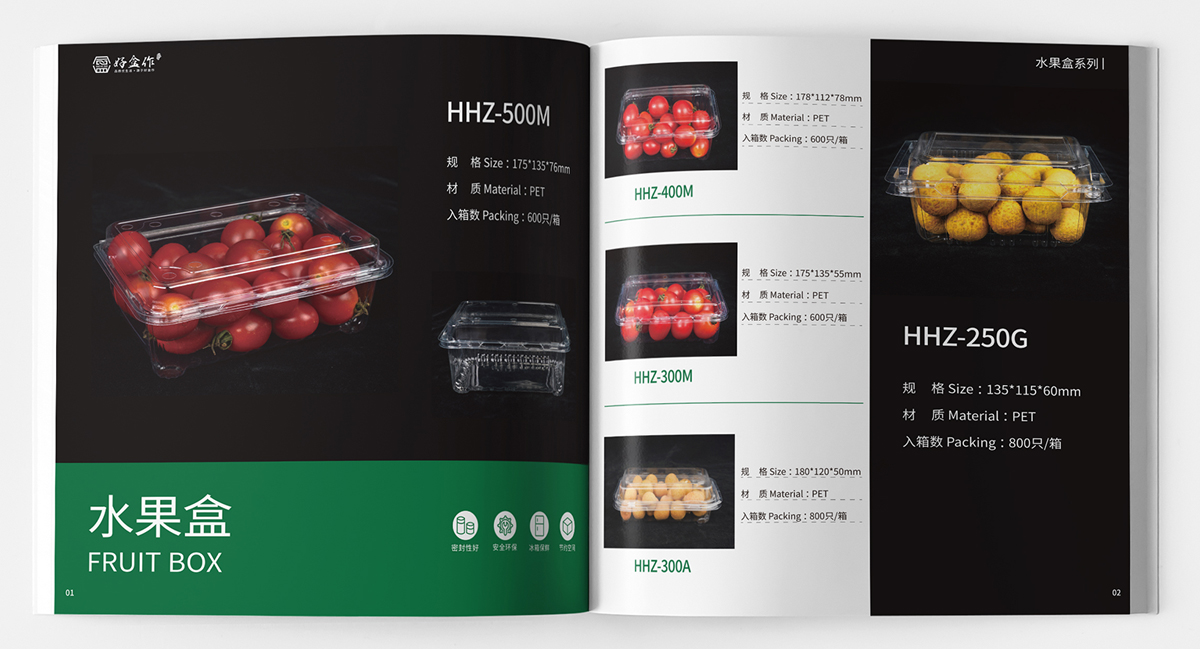 品牌介紹:蘇州金寶麗包裝部門,專注于PET生鮮包裝的研發、生產、營銷于一體的現代化運營模式,產品主要包括各種水果盒、沙拉盒、果切盒、禽蛋盒、生鮮托盤等視頻包裝容器,自主品牌“好盒作”全新全意為客戶提供一站式生鮮包裝的解決方案,畫冊設計風格整體簡潔大氣、黑色底更好突出透明盒的品質。