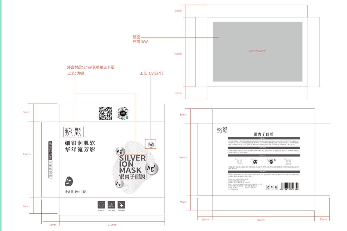 【品牌介紹】銀離子面膜|抗痘消炎凈膚,銀離子面膜,通過特殊的處理,將納米銀覆著在無紡布上,不間斷的釋放出銀離子,提升膚色,使肌膚飽滿,光潔而有彈性,整個包裝設計考慮到銀離子的特性,色彩以銀色為準,加上凹凸和燙銀的工藝,彰顯品質感。