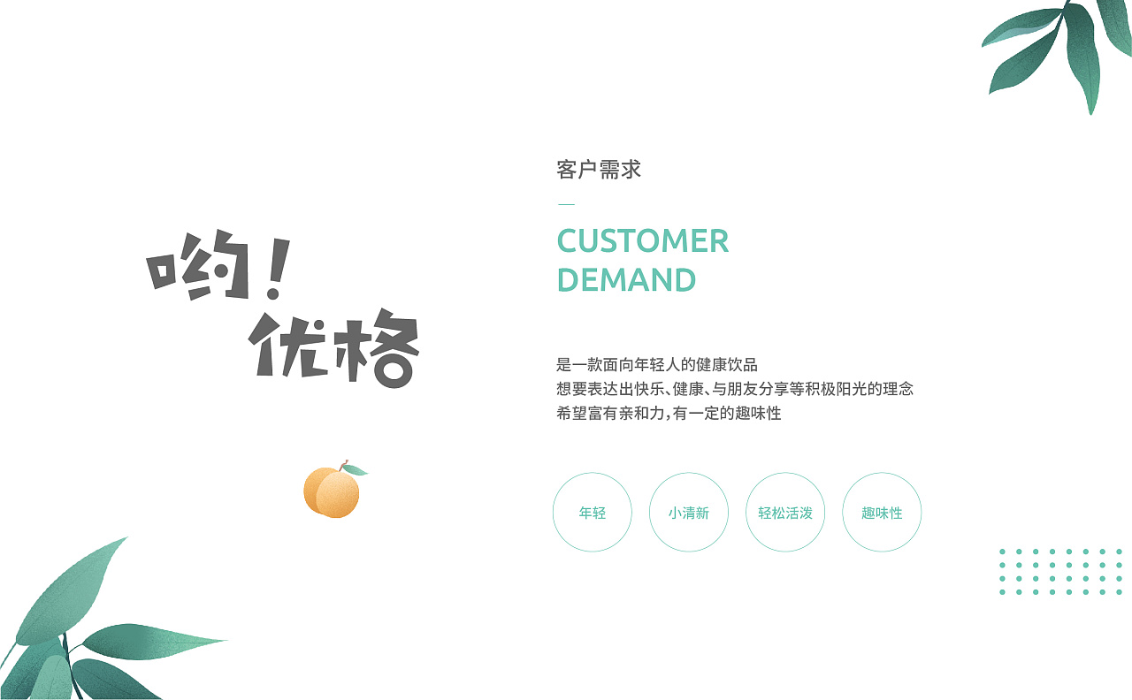 【品牌介紹】是一款面向年輕人的健康飲品,想要表達(dá)出快樂、健康與朋友分享積極陽(yáng)光的理念希望富有親和力,有一定的趣味性