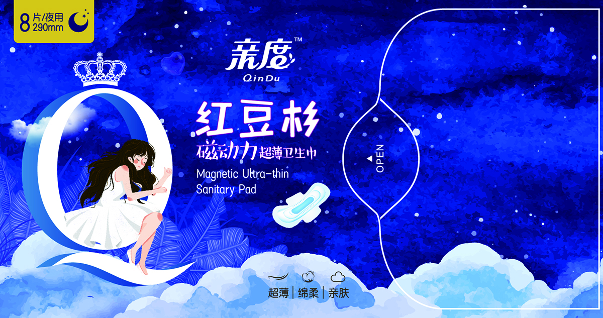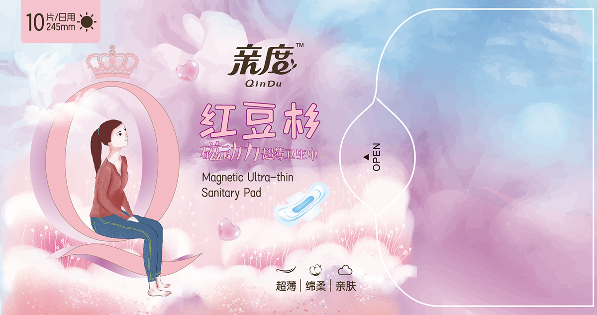 項目背景:親度紅豆杉磁動力超薄衛生巾,以每少女的卡通形象為主題的設計風格和個性,在與同類競品競爭中脫穎而出。對于中國女孩來說,衛生巾仍然是一個尷尬而私密的話題。因此,在衛生護墊市場上,“口袋大小的包裝”的概念應運而生,并因其時尚的外觀和超輕便的設計而廣受歡迎。特點:超薄 綿柔 親膚