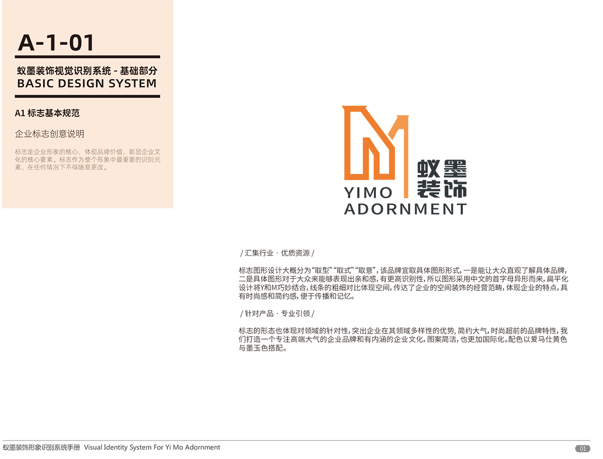 品牌介紹 :蘇州蟻墨裝飾工程有限公司經(jīng)營(yíng)范圍包括室內(nèi)外裝飾裝潢工程、建筑工程、幕墻工程、園林綠化工程、樓宇智能化工程的設(shè)計(jì)與施工;管道、門窗、水電安裝;銷售:建筑材料、金屬材料、五金交電。LOGO設(shè)計(jì),選用“YIMO”的首字母“Y,M”進(jìn)行圖形創(chuàng)意,設(shè)計(jì)簡(jiǎn)潔、配色以愛馬仕黃色與墨玉色搭配,偏平話設(shè)計(jì)講字母巧妙的組合在一起,通過(guò)線條的粗細(xì)突出層次感和空間感,傳達(dá)了企業(yè)的空間裝飾理念,易于傳播與記憶。
