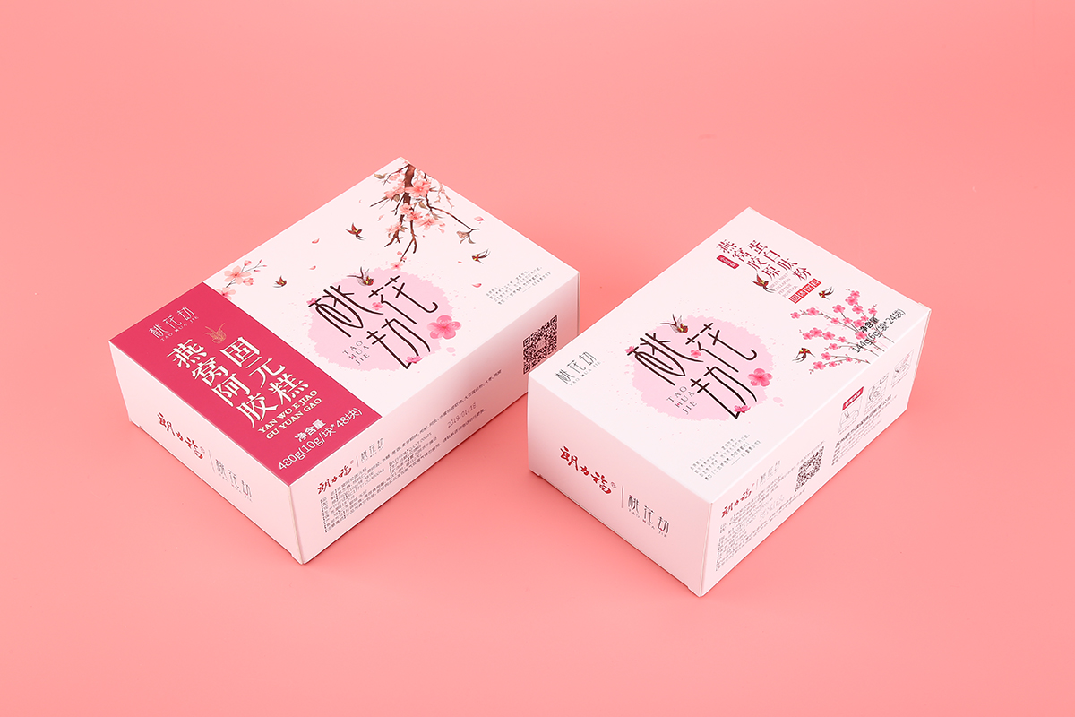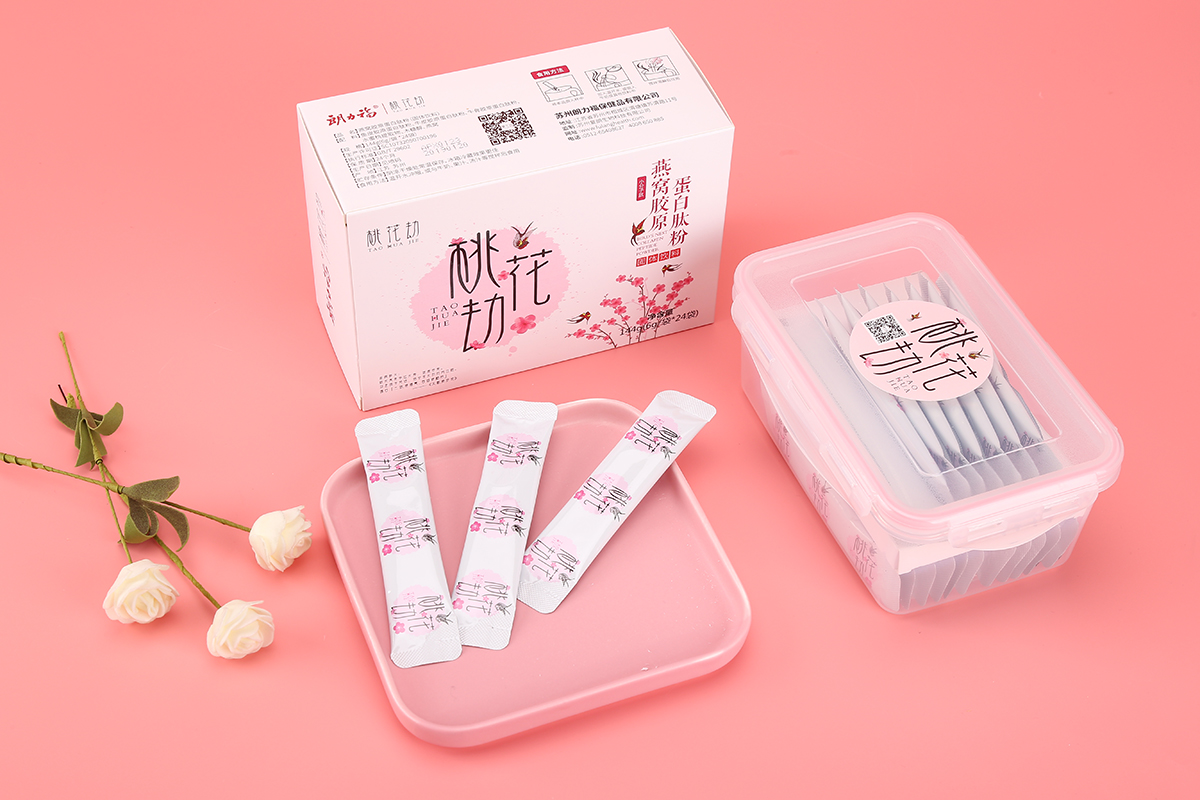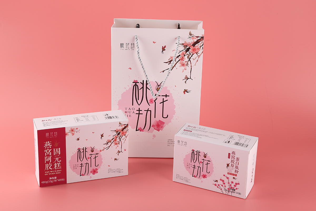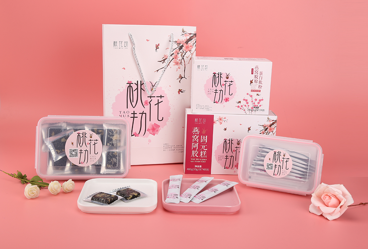 品牌介紹:朗力福集團之桃花劫品牌LOGO設計及包裝設計系列,桃花寓意幸運長壽、健康容美,好產品+極地視覺+好營銷就無敵了,考慮到是女性的保健品,整體風格設計的比較柔美、愜意。包裝設計分為2個系列固原糕燕窩阿膠、蛋白鈦粉燕窩膠原。