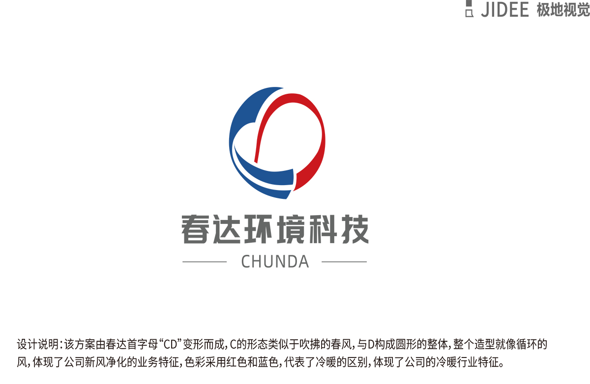 品牌介紹 :江蘇春達環境科技有限公司主營環保制冷、制暖系統領域的技術開發、技術咨詢、技術轉讓、技術服務;環保工程、凈化工程、室內外裝飾裝潢工程等項目,設計說明:該方案由春達首字母“CD”變形而成,C的形態類似于吹拂的春風,與D構成圓形的整體,整個造型就像循環的風,體現了公司新風凈化的業務特征,色彩采用紅色和藍色,代表冷暖色,體現公司公司產品的行業特性。