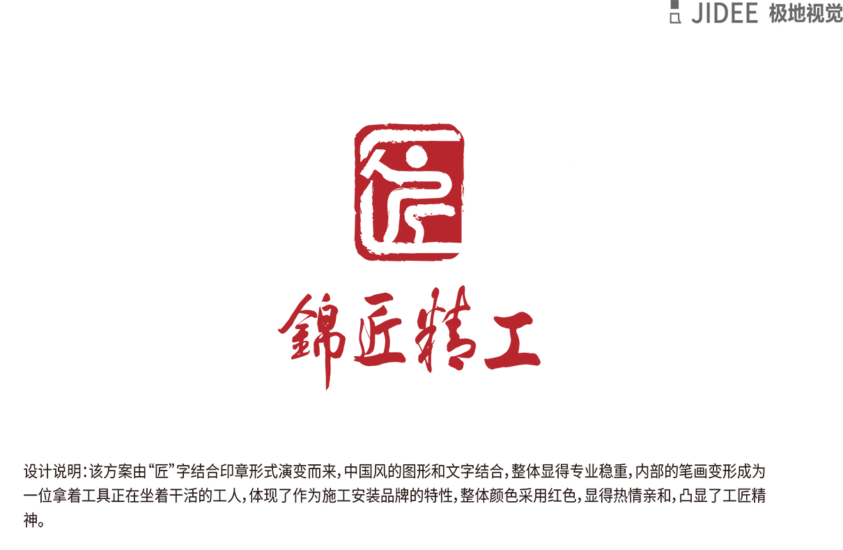 品牌介紹 :該logo設計方案由“匠”字結合印章形式演變而來,中國風的圖形和文字結合,整體顯得專業穩重,內部的筆畫變換成為一位拿著工具正在坐著干活的工人,體現了作為施工安裝品牌的特性,整體顏色采用紅色,顯得熱情親和,凸顯了工匠精神,是中國風的標志。