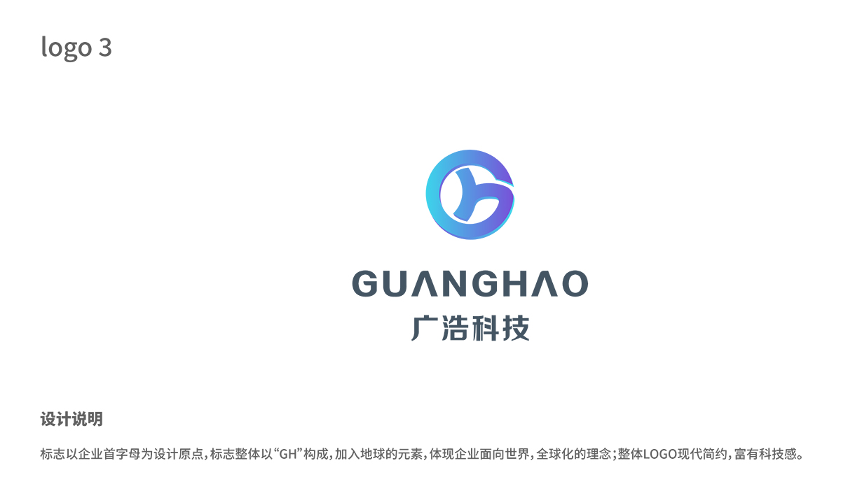 創(chuàng)意說(shuō)明:標(biāo)志logo設(shè)計(jì)以企業(yè)首字母為設(shè)計(jì)原點(diǎn),標(biāo)志整體以“GH”構(gòu)成,加入地球的元素,體現(xiàn)企業(yè)面向世界,全球化的理念;整體LOGO現(xiàn)代簡(jiǎn)約,富有科技感。