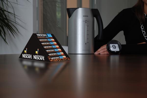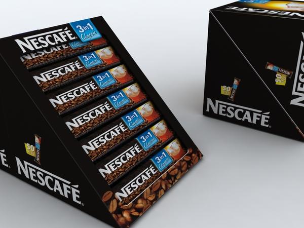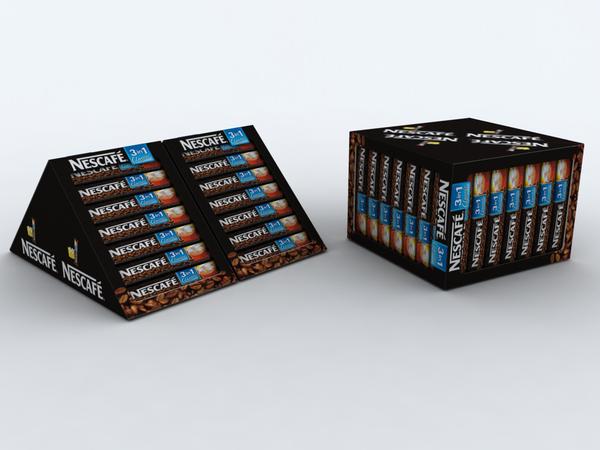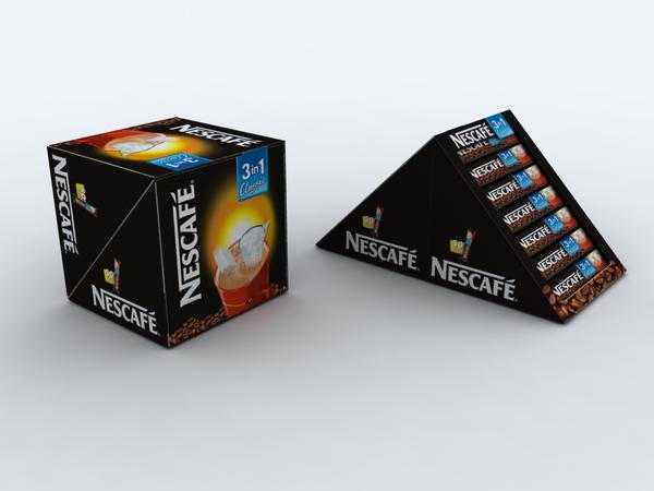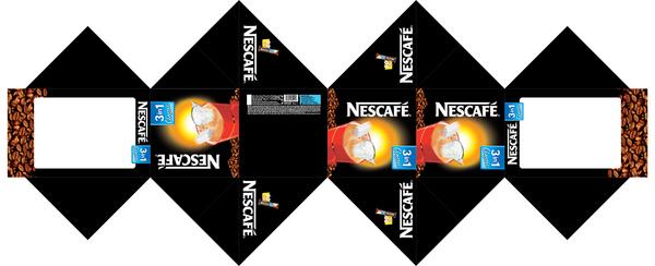 Nescafé雀巢三合一棒包裝設計,設計為擺放50件雀巢三合一棒的一個新包裝,它能放置在商店柜臺旁,家里的廚房,會議期間的桌面上等等。如果你把箱沿其對角線,你就會得到兩個三角部分。每一個部分可以擺放25支。三合一棒在框中,可以穩定地保持亦可容易取出。框的設計可以折疊,沒有任何膠結。