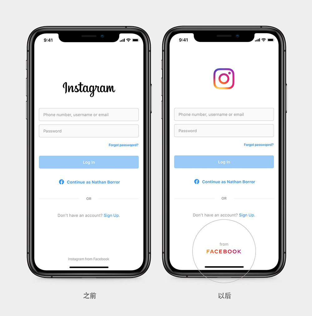 細節方面,字標具有自適應功能,比如在狹小的空間內,「Facebook」將會縮減為 「FB」字母組合,這個縮寫建立在其股票代碼的基礎上,已與Facebook建立緊密聯系。