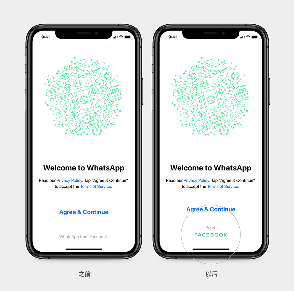 輕盈簡潔的字標以不同的顏色顯示,表現出旗下不同社交品牌的屬性,如藍色代表和公司同名的Facebook社交平臺,綠色代表WhatsApp(跨平臺應用程序,用于智能手機之間的通訊),粉色代表Instagram等等。
