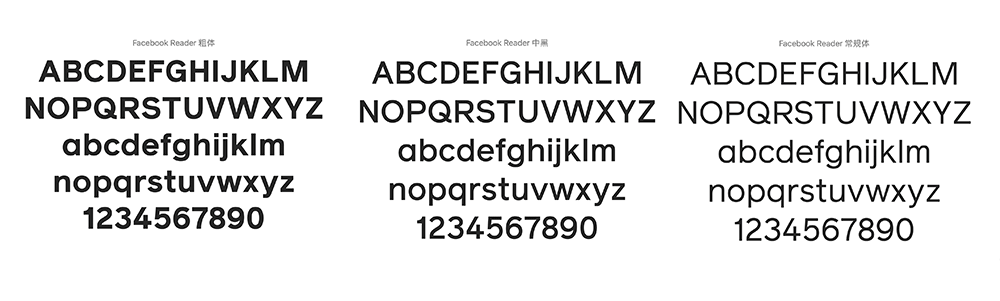 另外,Facebook還有一款專門定制的品牌字體「Facebook Reader」。這款非常現代的無襯線字體被應用于Facebook Web頁面、應用程序以及傳統印刷的正文部分。字體由粗到細分為Bold、Medium和Regular三種字重,喜歡的小伙伴可在文末下載體驗。