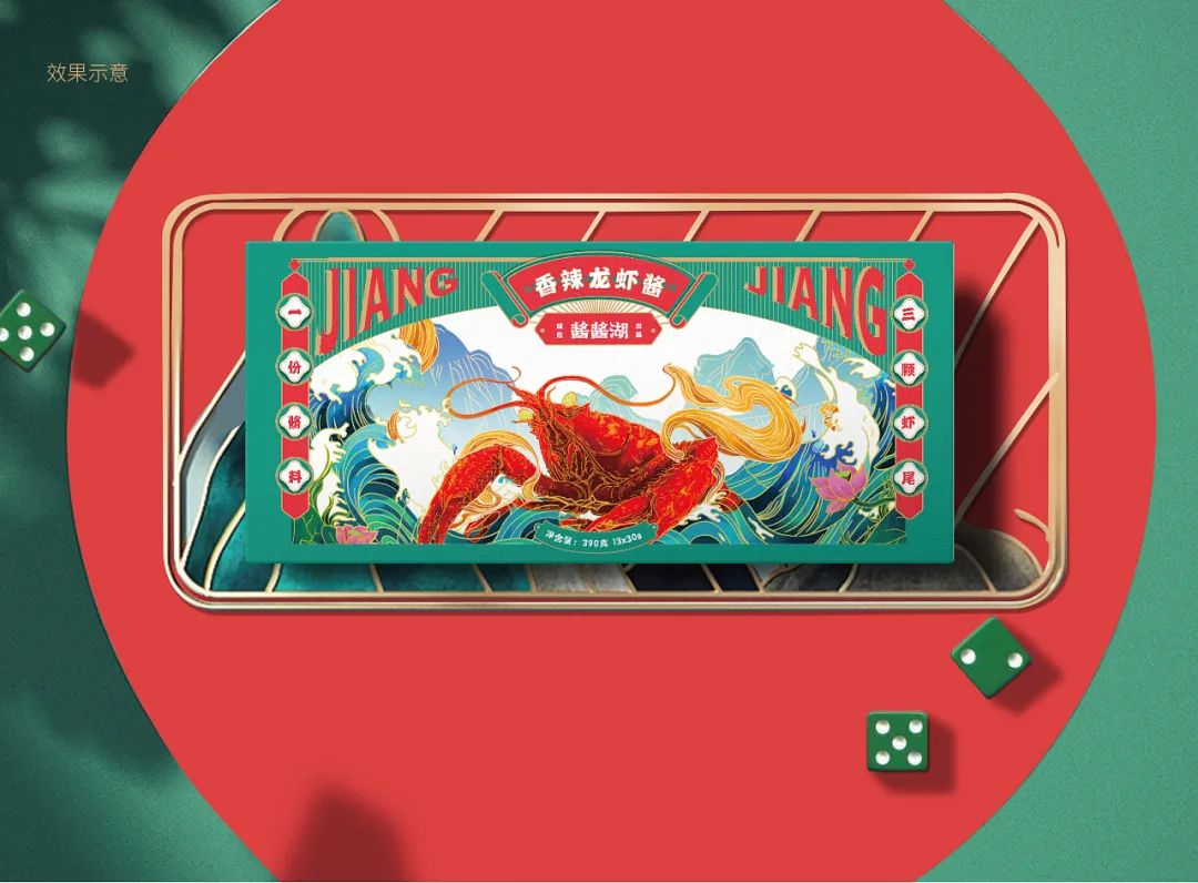 有別于市面上常見的醬料包裝,這款香辣龍蝦醬以新國潮風進行插畫設(shè)計,紅、綠色調(diào)的搭配盡顯復(fù)古質(zhì)感,封面則是對聯(lián)及畫幅共同展開的姿態(tài),給予用戶開啟包裝前的儀式感。內(nèi)盒獨立包裝則以麻將為創(chuàng)意來源,將麻將牌中的“發(fā)、東、南、中”字樣作為主視覺,紅色正楷字體還原了麻將的基本造型。外觀延續(xù)國潮風的插畫設(shè)計,加入色調(diào)豐富的傳統(tǒng)花紋式樣裝飾,以此突出龍蝦醬的獨特性,也賦予了包裝在貨架陳列上強烈的陣列感。