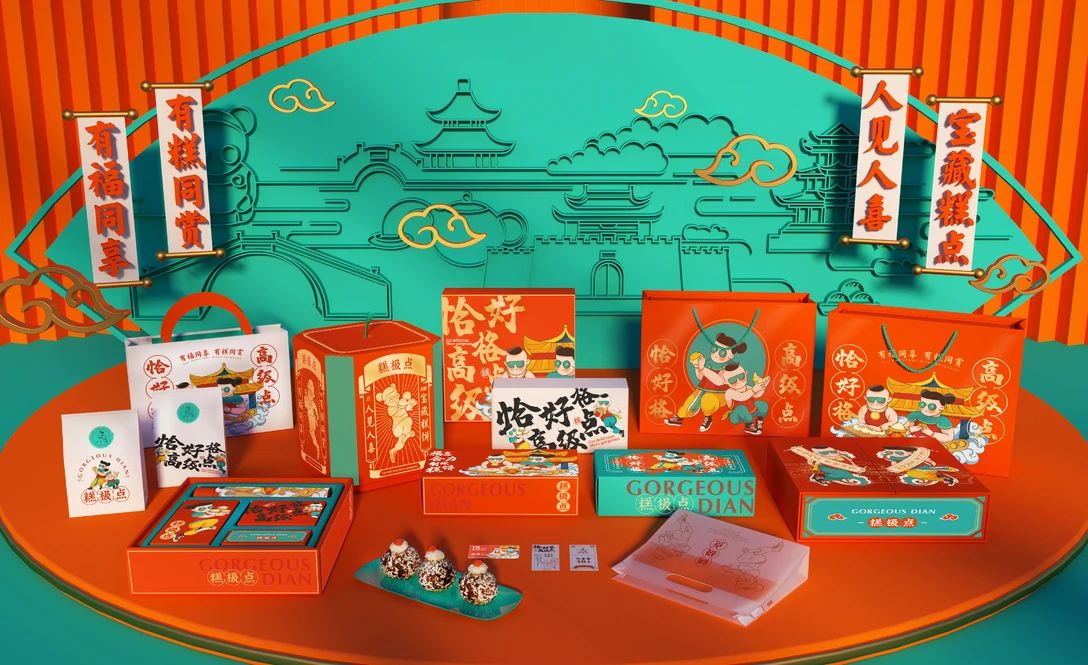 從這個食品包裝設(shè)計可以發(fā)現(xiàn)在糕極點是走的國潮糕點的路線,突出有潮范的東方腔調(diào),用年輕人喜歡的方式展示出來。設(shè)計的理念也很是不錯:清明橋上曲悠悠,潑茶蒸餅俏眉頭,并把潮流來混搭,滿屋老小見歡喜。勾勒出了一個新潮又復(fù)古的東方世界。摒棄糕點固化的傳統(tǒng)模式,不斷強化無錫本土品牌概念,以大阿福作為本土形象代言。阿福福德德,阿喜客氣頭。本土潮仔,由無錫泥人演變而來,寓意送福送喜、祥瑞云集。把墨鏡、運動鞋等時尚元素加入其中,實現(xiàn)糕點與新國潮IP的跨界聯(lián)合。品牌主色調(diào)為愛馬仕橙與綠,色彩之間碰撞和對比,呈現(xiàn)出強烈的視覺沖擊力。表達出品牌內(nèi)核的力量,年輕張揚,自由無懼,充滿無限可能。