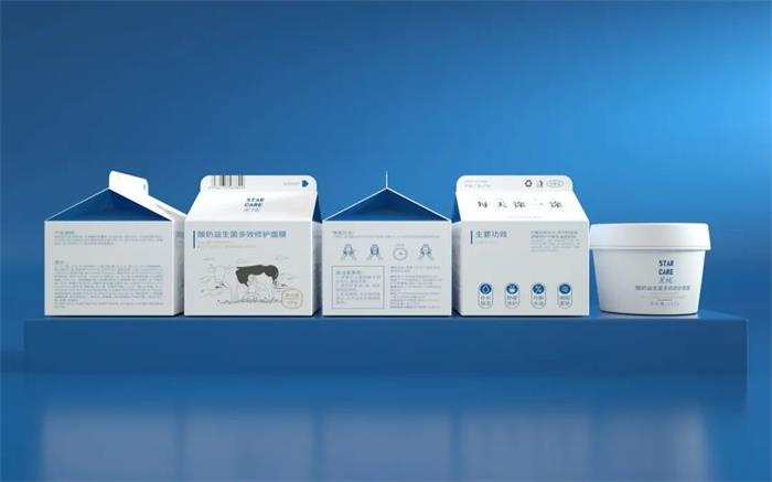 不同于市面上的常規(guī)包裝,這款面膜外形上便采用了酸奶盒的造型,兩種盒型設(shè)計(jì)巧妙呼應(yīng)了,品牌名的“酸奶”屬性。極簡白的外盒背景,插畫同樣以簡筆線條勾勒了農(nóng)場實(shí)景,畫面中奶牛與女孩正相互依偎著,白云與遠(yuǎn)山、草地的景觀元素點(diǎn)綴,表明了一片生態(tài)和諧的自然環(huán)境。藍(lán)色調(diào)的運(yùn)用在純白背景映襯下形成了鮮明個(gè)性的視覺沖擊,背面繪以輔助圖標(biāo)清晰闡明產(chǎn)品信息,加上主次分明的文字設(shè)計(jì),給人一種舒適、自然的感覺。另外在斜切面上,還以拼音方格的形式,加入了“每天涂一涂”的趣味文案,消費(fèi)者能迅速了解產(chǎn)品的使用方式,也為包裝增添了幾分童趣。