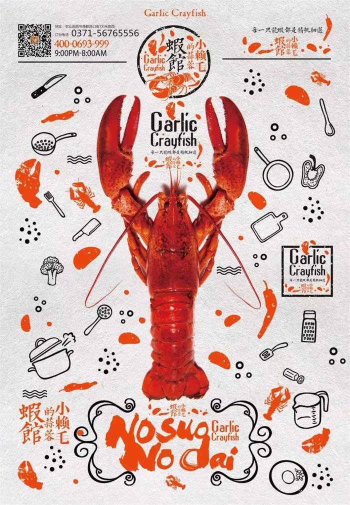 小賴毛的蒜蓉蝦館采用濃厚的色彩來,表現(xiàn)海鮮的鮮與兇猛,大膽的紅白黑撞色能從感官上刺激食欲,手繪圖案搭配兇猛小龍蝦,手繪風(fēng)與寫實風(fēng)的碰撞帶來強烈的視覺效果。以眾多細小的廚房用品為輔助圖形,細節(jié)感與層次感up up up,涂鴉風(fēng)格的應(yīng)用很年輕時尚。
