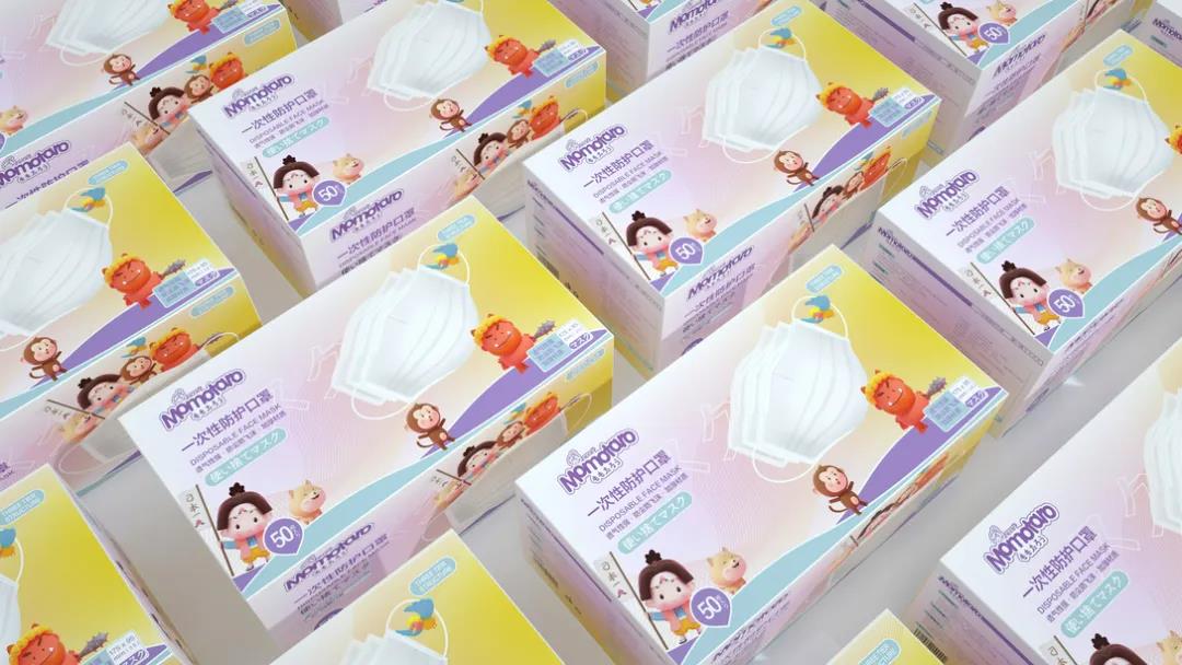 日式風(fēng)格的口罩包裝,插畫IP靈感來自于日本五大童話之首《桃太郎》,生動(dòng)勾畫出五個(gè)主要?jiǎng)赢嬓蜗螅种锫劦墓适滦詧?chǎng)景貼近生活。