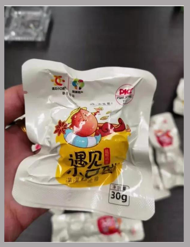 設(shè)計(jì)配色時用了棕色系,既突顯了鹵蛋本身的顏色,與白底包裝袋形成鮮明對比,同時這樣一深一淺的搭配,也讓整體畫面更加明快。