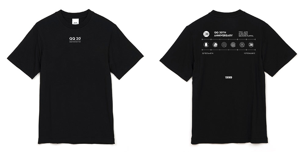 T恤的圖案從QQ20周年logo圖形中延展設計出各類代表圖形,正面簡潔直接地顯示出本次主題,把醒目的圖形放置于T恤背后,利用坐標軸和經緯度的信息圖案配合各個抽象化的宇宙元素,增加T恤設計的科技感,更明確地展現了科技向善的愿景。