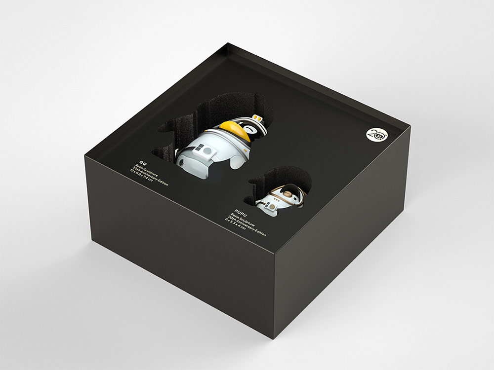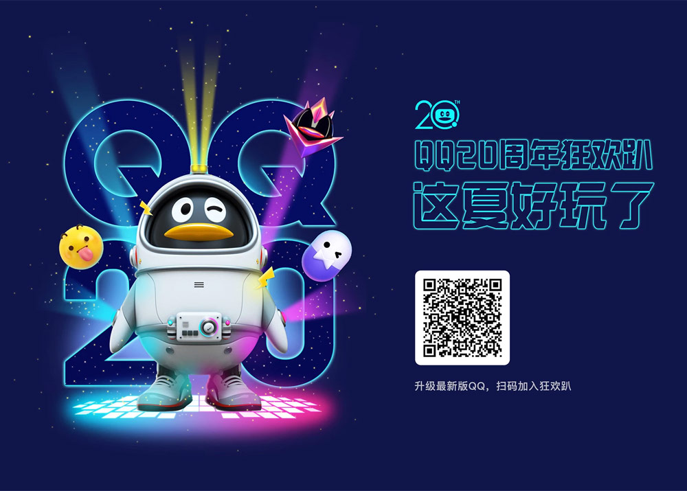 配合QQ20周年慶,設計團隊給8m高的巨型QQ模型搭配上了貼紙設計,以slogan “QQ更好玩” 為設計的出發點,希望把有趣好玩的態度注入各個品牌中,為品牌logo嚴肅的視覺帶來玩味感和潮流感。