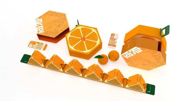 良橙同音良辰,意寓美好的日子,美好的時(shí)光,美好的橙子。此款仿橙子的折紙盒包裝設(shè)計(jì)幫助品牌定位市場(chǎng),并且給消費(fèi)者們留下了深刻的印象。外殼的包裝上展示著橙園自然勞作的景象,脫去外殼的包裝,里面竟然也是一牙一牙地一個(gè)被切開(kāi)的橙子。巧妙地運(yùn)用仿生手法,使得包裝具有具有極高的辨識(shí)度,包裝與產(chǎn)品之間緊密聯(lián)系。