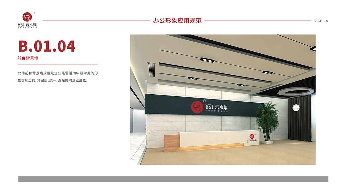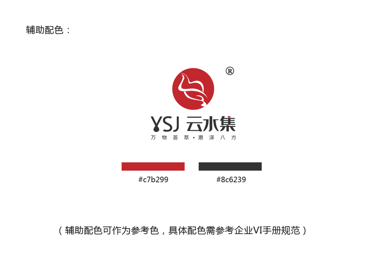 LOGO圖形創意中將“云水集”音節首字母“Y、S、J”構圖成鯤鵬圖案,其動作欲展翅飛天,寓意企業懷抱鯤鵬之志,平臺遠大,“萬物薈萃,惠澤八方”。字母“Y”與水滴相結合,代表企業初創凈水產品,在品牌LOGO中保留其造型是為了警示企業所有員工不忘初心!