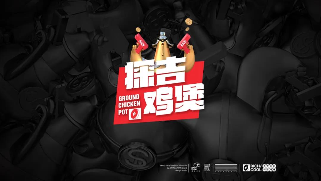 品牌的LOGO圖案是一只帶著盔帽、雙翅拿著手槍的金色立體雞形象,探出方形的紅色底色,探吉雞煲四字兩兩上下分布,字體線條粗大寬扁,頗有種財大氣粗的感覺,小銅錢在左下角與英文組合,使LOGO的呈現(xiàn)形態(tài)更加統(tǒng)一完整。因為與吉利、財神等掛鉤,所以品牌在用色上選取了財神紅,搭配銅錢質感的金屬灰杏色,黑色用于強調氛圍感。