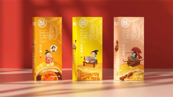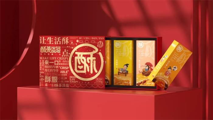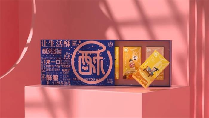 蘇州食品包裝設計禮盒分為紅、藍兩款主色調包裝,圖形化的“酥”字占據了大部分封面,柔軟的筆觸與裸粉色調,形成品牌的視覺符號。左側則是滿版的產品賣點排版,重點突出“酥服”等俏皮文案,進一步強化品牌調性,以直戳消費者痛點的文字表達,激發其購買欲。抽拉式禮盒便捷易開,加之透明內封的裝飾保護,賦予包裝更多的收藏和送禮價值。內盒獨立包裝將畫面定格在古代,古裝小人IP正在認真工作、,乘轎外出或品嘗美食,并且將手繪插圖的蛋黃酥為“背景板”,寓意沉浸在美食的世界~