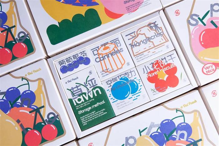 甜品禮盒整體呈現美式復古的油畫質感,純白背景的基礎上以水彩插畫為主視覺設計,并加入了梨子、櫻桃等水果元素,飽和暖色調的使用更易增加消費者食欲。